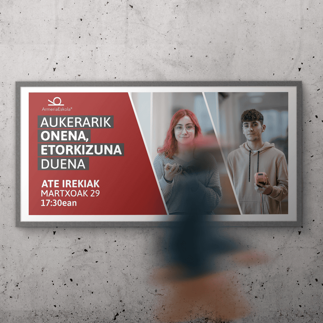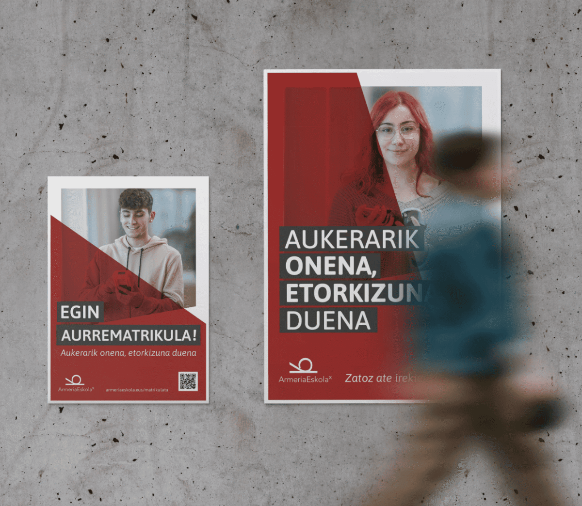 Armeria Eskolaren komunikazio beharrei erantzuna emateko asmoz, ikasle potentzialen beharrak aztertu eta analisia egin ondoren, diagnostikotik abiatuta kaptazio kanpaina osoa garatu dugu: leloa, iruditeria, diseinua, karteldegia, katalogoa… euskarri guztiak egokitu ditugu kanpainaren baitan.